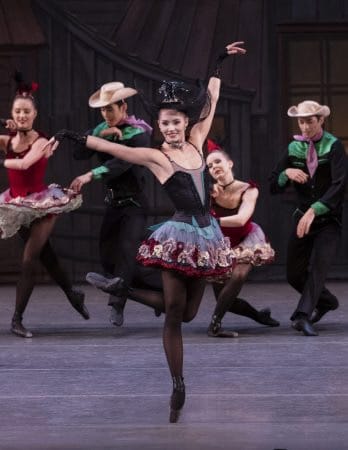 Fortunately, they both reappeared, happy at last, in the glorious finale, led by Unity Phelan as the woman with the gorgeous hat and Roman Mejia as the hottest cowboy on the plains. Phelan looked like she was having the time of her life as she roared through the choreography, showing off some magnificently centered fouettés. Though she danced with her usual elegance, her cool refinement vanished in the flurry of that infectious music and the fast, joyful choreography. Mejia was in his element, tossing off some seemingly impossible jumps and turns with an irresistible warmth; even a turn that didn’t quite make it became a joke to share with the audience. He turned hIs pure physical joy into a gift to the audience.