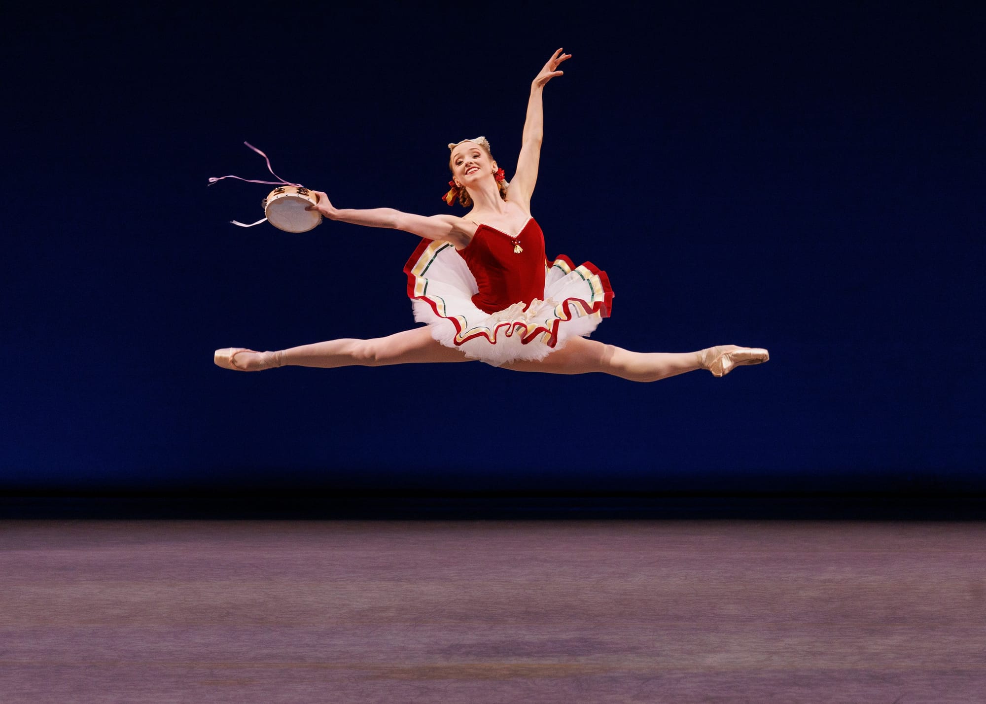 Emma von Enck and Sebastian Villarini-Velez certainly deserved their curtain calls in “Tarantella”, Balanchine’s non-stop romp to Louis Gottschalk. Von Enck, who had such a memorable debut in “Rubies”, brought the same bounding joy and crisp articulation to “Tarantella”; her pirouettes with her tambourine and her insouciant head kicks were pure adrenaline. Both dancers had a wonderfully witty timing, and seemed to enjoy their dance-off.