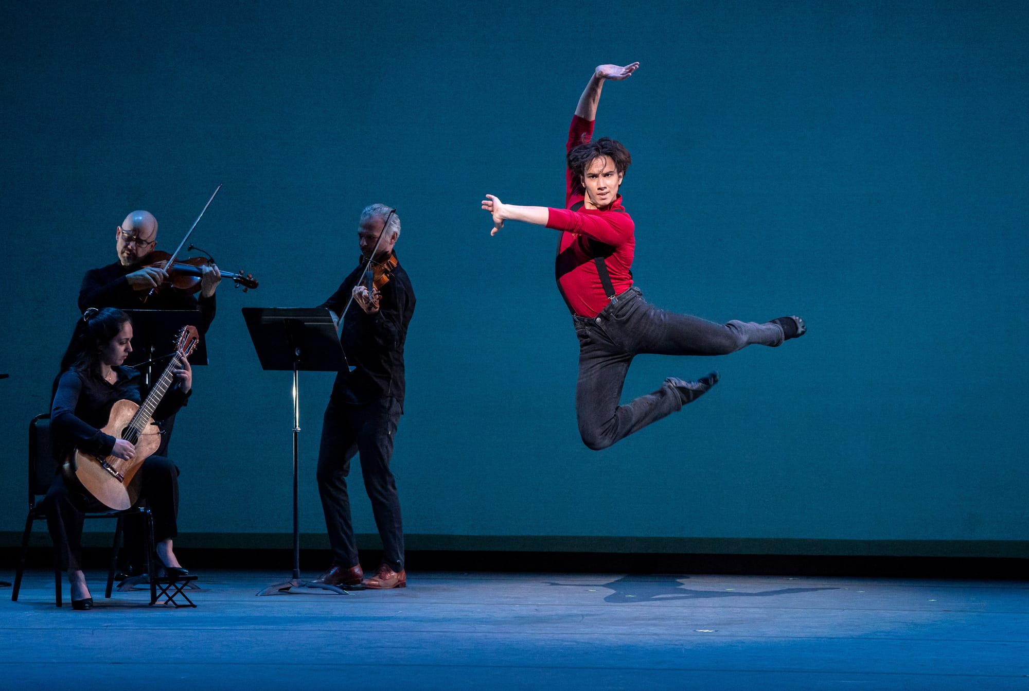 It wasn’t the only work to show such integration – a similar interplay happened in “Fandango.” The decade-old Ratmansky solo was updated to feature not Wendy Whelan on whom it was staged, but New York City Ballet’s recently promoted soloist and rising star Roman Mejia, and consequently more masculine, jump-driven moves. Mejia is a promising young dancer, but stepping into a work set on a legendary ballerina, let alone making it your own, is a formidable undertaking. He excelled. Throughout the piece he exuded confident masculinity, but in the elegant way that was a nod to Whelan’s take on the role. His gestures, accenting, and, not least of all, interacting with the musicians (and even sharing of a tambourine), had a commanding quality. Somehow though, it seemed that it was his presence that “made” the piece, not the other way around. When Mejia executed his last sequence of turns and collapsed on the floor, it didn’t feel like it was from exhaustion, or at least not dance-induced exhaustion, but rather from working to contain the energy restrained by not being given enough movement to really let loose. Perhaps we’d get to see its full force in a different work soon.