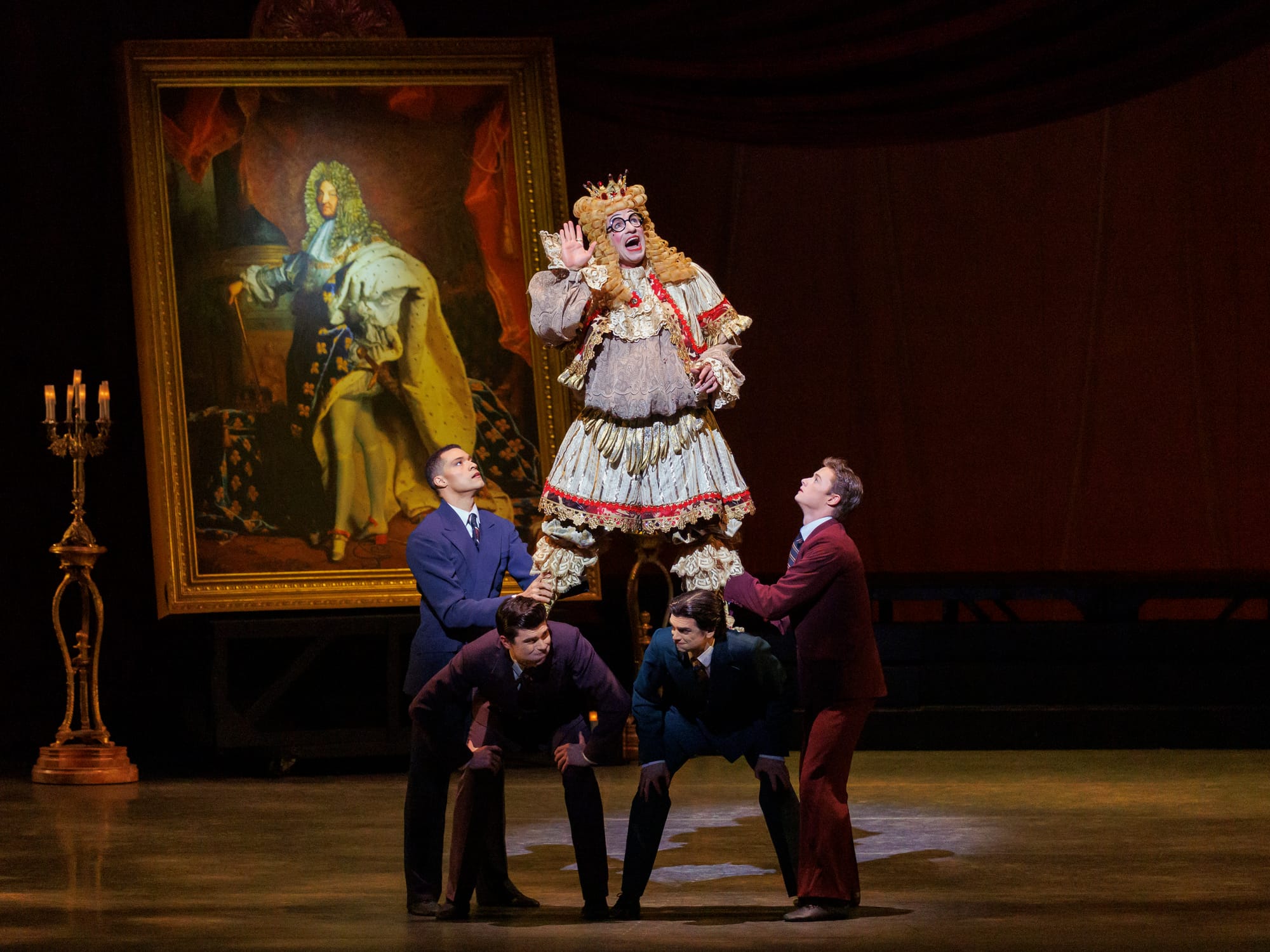 Three wackily dressed swindlers convince him to buy the clothes; his unfaithful wife dances a series of burlesque duets with her Lover, and this all takes place in a court of six buffoons called the King’s Entourage surrounded by a corps de ballet of 12 exuberant Townspeople. The King is swindled, the Queen and her Lover dance their duets, the Entourage and Townspeople have wonderful group entrances, until in the end a young boy enters loudly declaiming, “The king is naked.”
