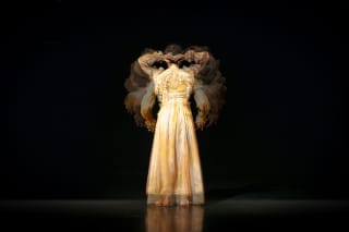 The piece begins with nothing but a dress – a full-length, frilly see-through chiffon – draped over a slip, revolving in the air. In time the dancer appears behind it as a pair of feet and two sets of fiddling fingers, and proceeds to inhabit the garment.