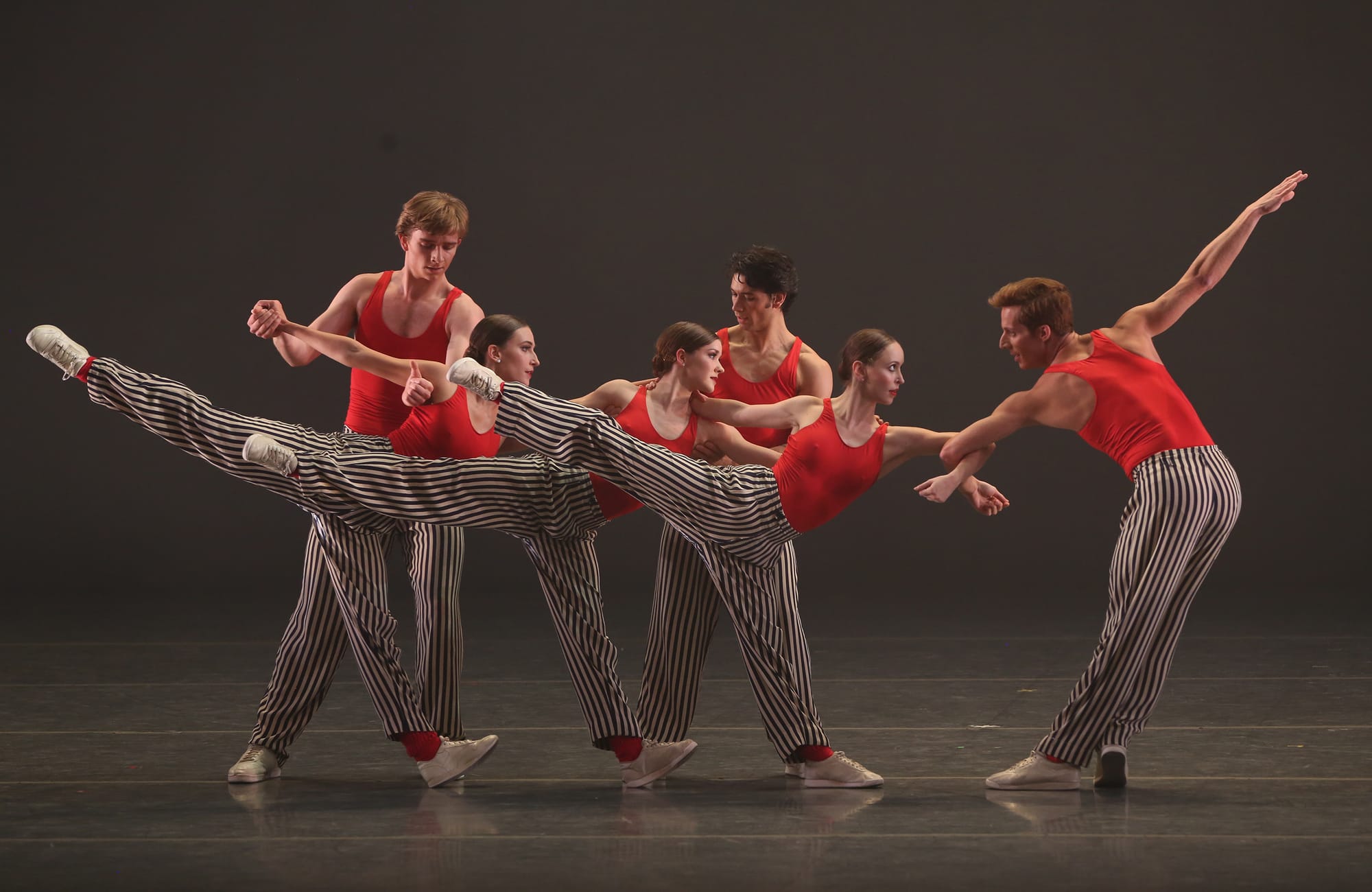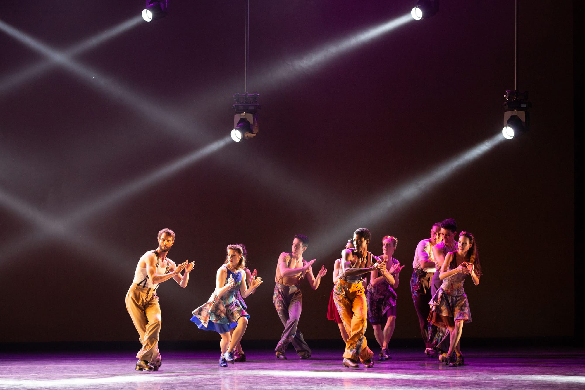A series of jazz dances broke the work (costumed by Linda Cho in colorful chiffon jazz dress for the women, Massine pants, T shirts and suspenders for the men) into sections, as the ensemble performed a Lindy Hop, Fox Trot, Jitterbug or other such number in succession. In the penultimate section, Royal briefly performed a mournfully plastic solo full of backbends and stretches, alone on the stage, to a recording of a 1940’s ballad, as if faintly heard in the distance. In the finale Dorrance let herself go into a large scale, stomping and clapping tap dance number of the kind she’s become famous for.